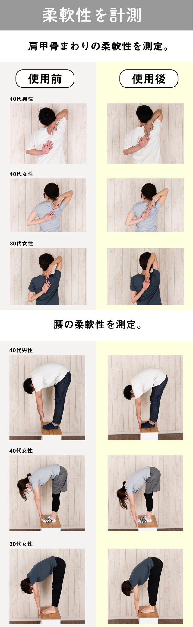 使用前の柔軟性と、「リセットドーム」で肩甲骨と腰回りのストレッチを重点的に行った後を比較をしました。