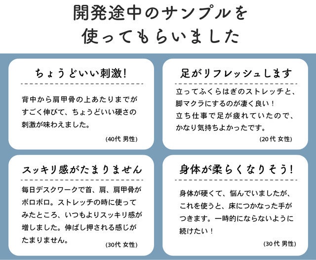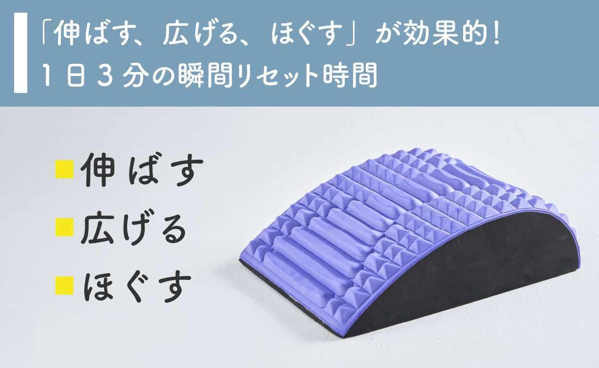 「リセットドーム」は、しっかりと身体を伸ばすだけでなく、指圧効果によるコリほぐしが同時に行えるので、とても気持ちがよく瞬間的に姿勢の悪さをリセットしてくれます。