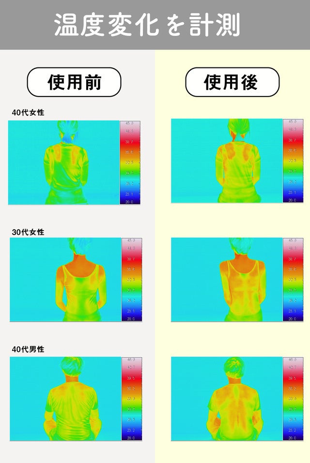 サーモグラフィを使い、「リセットドーム」を使用前と、3分間使用した後の上半身の温度を計測。