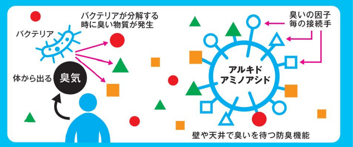化学合成物を一切使用していないデオボイドは、使用成分の植物由来のアミノ酸誘導体《アルキドアミノアシド》に嫌な臭いと結合する因子をつけてあるため、つかんだ悪臭を放しません。シュッとすれば、嫌な臭いを消し去ります。