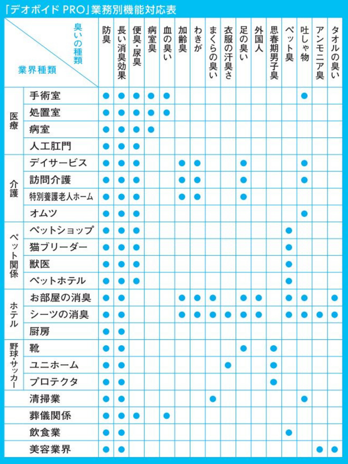 臭い問題に悩むプロの現場で長年ご愛用いただいてきたデオボイド。一般家庭でも様々なシチュエーションでお使いいただけます。