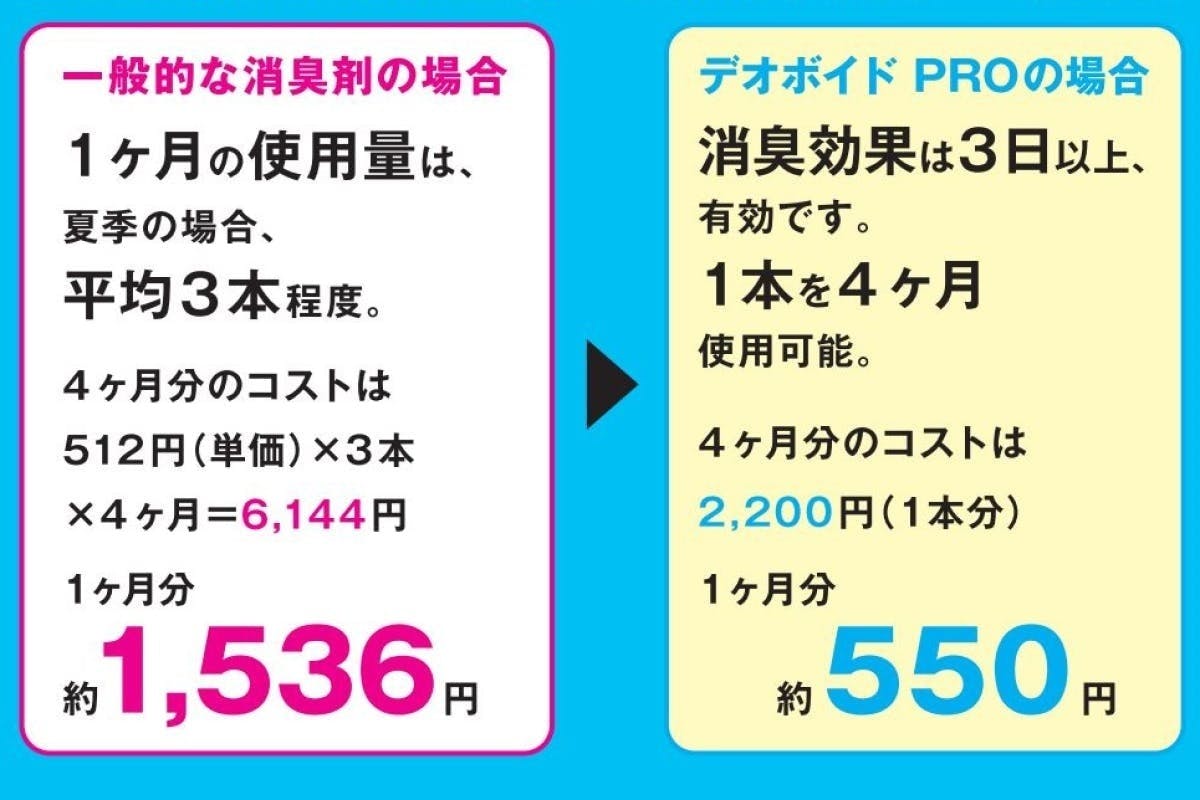 しかし、「デオボイドPro」は段々使用回数が減ってきますので、結果として平均して4ヶ月も使用することが可能です。