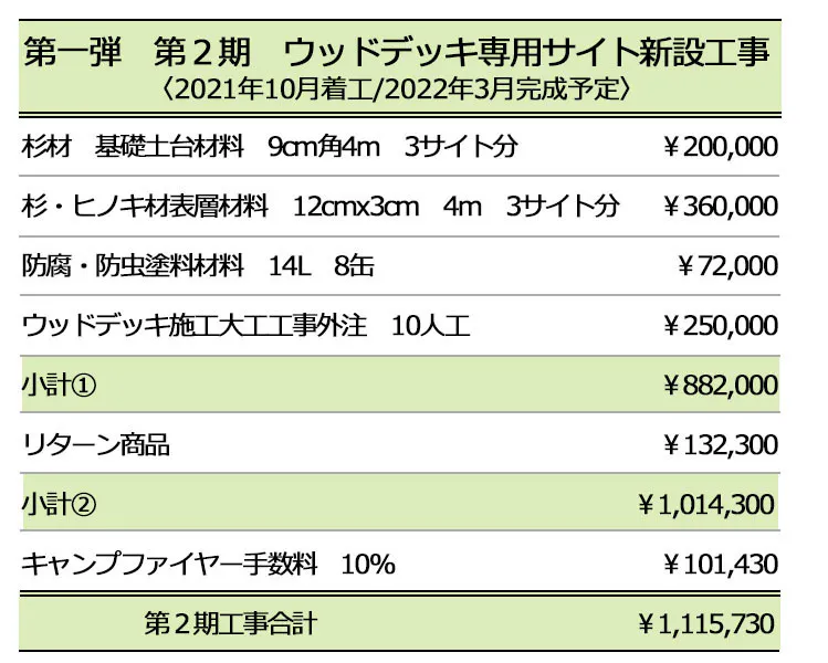 2021年11月25日終了の第一弾クラウドファンディングでご支援いただきました支援金にてウッドデッキサイトの新設をスタートしています。