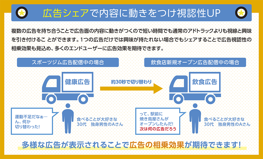 ・複数の広告主で1車両を利用する場合は通常のアドトラックを利用する場合よりも低価格で利用できます。また、複数の広告が配信され ることで広告面が変化することで飽きられにくく、それぞれの広告に興味を持ってもらえる可能性が高まります。