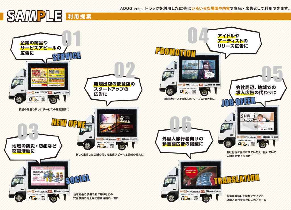 このサービスは「アドトラックを利用したシェア型屋外広告配信」と「アドトラックで配信中の広告詳細情報をwebサイト「ADOO.CM」で公開」という二つのサービスで構成されています。