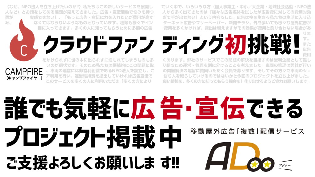 車両管理は弊社が行い、広告サービスの運営は別団体として非営利団体を設立し、この問題解決の趣旨に賛同いただけるご協力者様を募り、ご協力者様全体で車両のシェア利用を行い、運営維持費を捻出していければ広告宣伝で悩む人を減らしていけるのではないかと考え、今回のプロジェクトを立ち上げました。