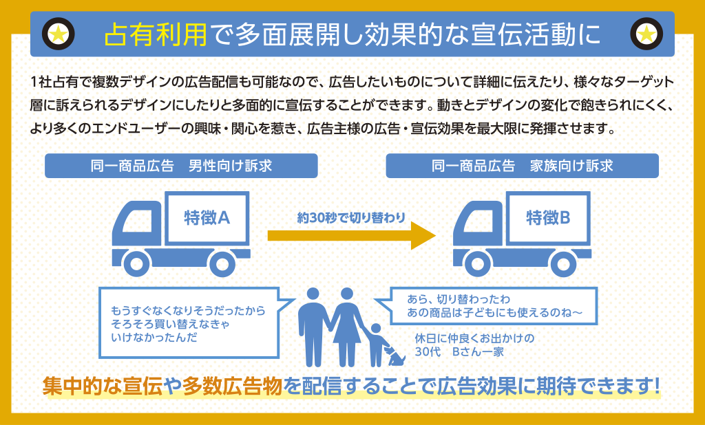 ・1社で1車両を占有利用する場合は1回の利用で多くの情報を発信でき、広告内容に興味あるユーザーへ多くの情報を提供できます。