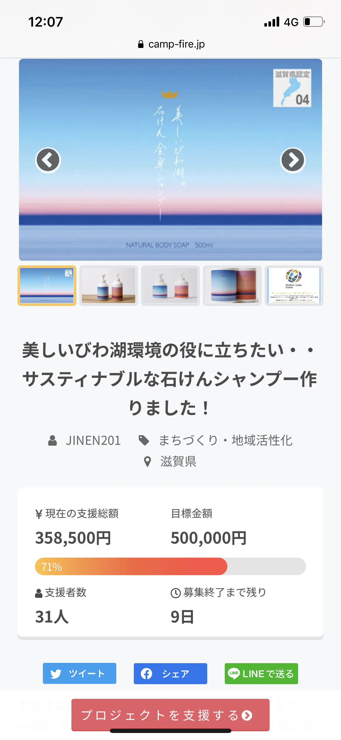 「美しいびわ湖石けん全身シャンプー」プロジェクトオーナーのJINEN201です。