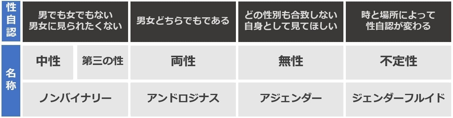 名称においても日本では「Xジェンダー」と呼ばれることが多いですが、海外ではクィア、ノンバイナリー、アンドロジナスなど様々な呼称があり、当事者の感覚が人それぞれ違うことがうかがえるかと思います。