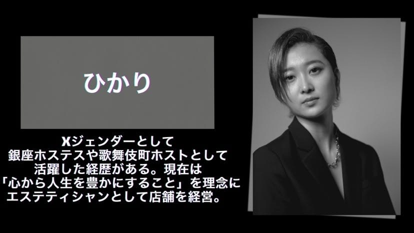 男でも女でもないXジェンダー(ノンバイナリー)。香港人の母と日本人の父の間に生まれ、幼少期から海外で過ごし国際的な文化圏で育つ。物心ついたころから性違和を感じるも答えが見つからず、20代に入ってどちらでもないという概念にたどり着く。
