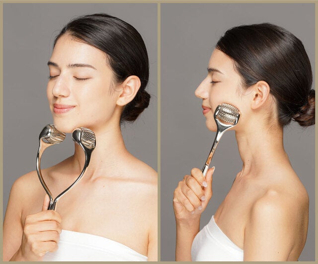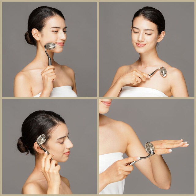 コンパクトサイズの「Cellsh フェイシャルエステローラー」は年齢とともに気になる目元、口まわり、おでこ等の細部のお手入れができます。また、首筋、デコルテ、手や足などの様々なポイントにお使いいただけます。342本の刺さない鍼が表情筋の筋膜を刺激し、引き上げてくれます。癖になる、”いた気持ちいい”を感じてください。
