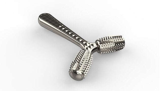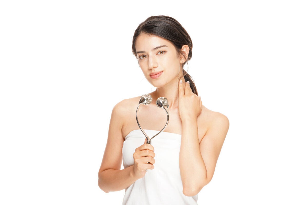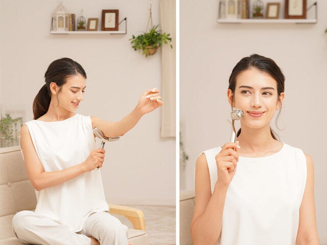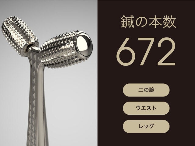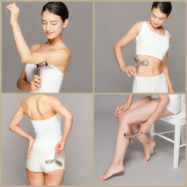 「Cellsh ボディエステローラー」は二の腕やヒップライン、ふくらはぎ、太ももなど、身体全体のケアにオススメです。672本の刺さない鍼が体の筋膜をほぐしながら、肌表面を心地よく刺激します。持ち手部分からY字型形状に伸びるローラー部分は、左右対称に肌へとフィットします。それは、まるで人の手で持ち上げられているような感覚です。筋肉が固まってきた、体型の気になる方におすすめです!
