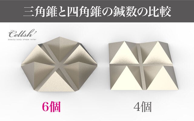 Cellshエステローラーシリーズは、鍼の形がすべて”三角錐”になっています。肌や頭皮をより刺激する形を追求した結果、同じ面積でも、より多くの刺激を与えられる”三角錐”の形状を採用しました。