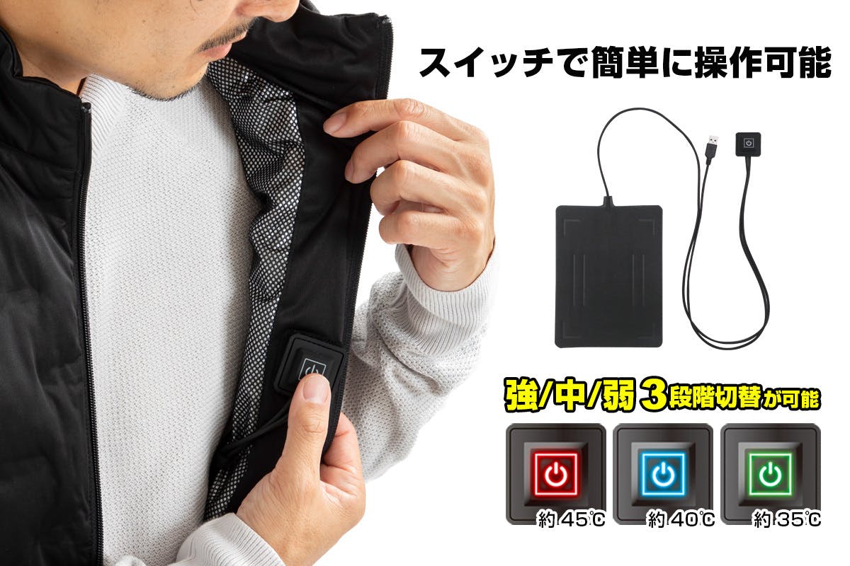 ●付属のスイッチ付きヒーターパッドには操作スイッチがあり、強(約45℃)・中(約40℃)・弱(約35℃)と切り替えることが可能です。操作スイッチは、目立たないように服の内側に取り付けるようになっています。操作スイッチ部は、マジックテープ式なので着脱も簡単です。LED表示で現在のモードを確認できます。ヒーターは熱くなりすぎない様に、55℃(±5)で自動的に安全保護機能が働いて切れる様になっておりますので安心です。