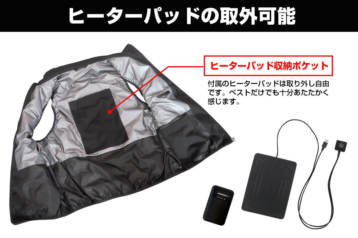 さらに取り外し可能なヒーターパットが付属しています。バッテリー10000mAも付属していますのですぐ使えます。(バッテリーはPSEマーク取得済み)