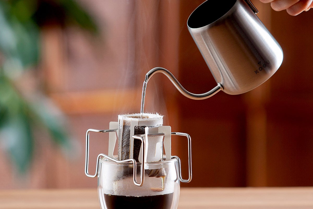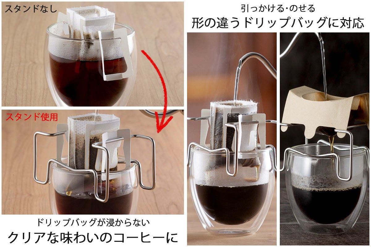 ドリップバッグが注いでるコーヒーに浸からない!浸からないので雑味のないクリアな味わいに。スタンドはカップの上にのせるだけ。カップ外径7~8.5cmまでに対応します。