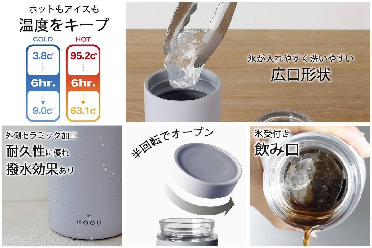 コーヒーを美味しく飲めて、扱いやすいボトルに。①真空二重構造の断熱効果で優れた保温力。②ボトル本体は耐久性・耐食性の強い18-8ステンレス素材を使用。 ③本体内部は銅メッキ加工を施し内部の熱を閉じ込める。④キャップの開け閉めも半回転でスムーズ。⑤中フタの飲み口は透明度と耐熱性のあるトライタン樹脂を使用、中身がしっかり見えます。⑥飲み口で金属臭もなく口当たりもなめらか。氷を入れても飛び出しを防げる。 ⑦広口で奥までしっかり洗える。⑧内面テフロン加工で汚れも落ちる。⑨外側はセラミック加工で耐久性に優れ撥水加工で汚れにくい。⑩食器洗浄機対応。