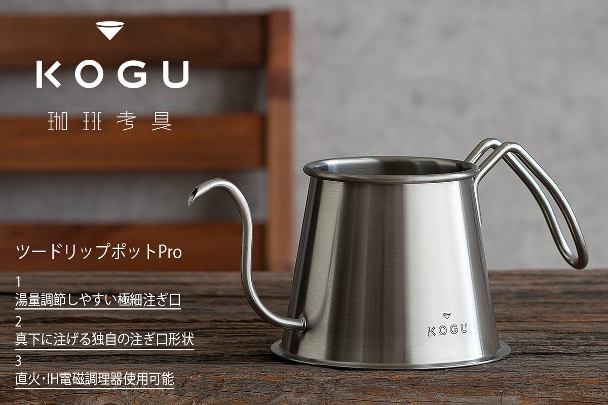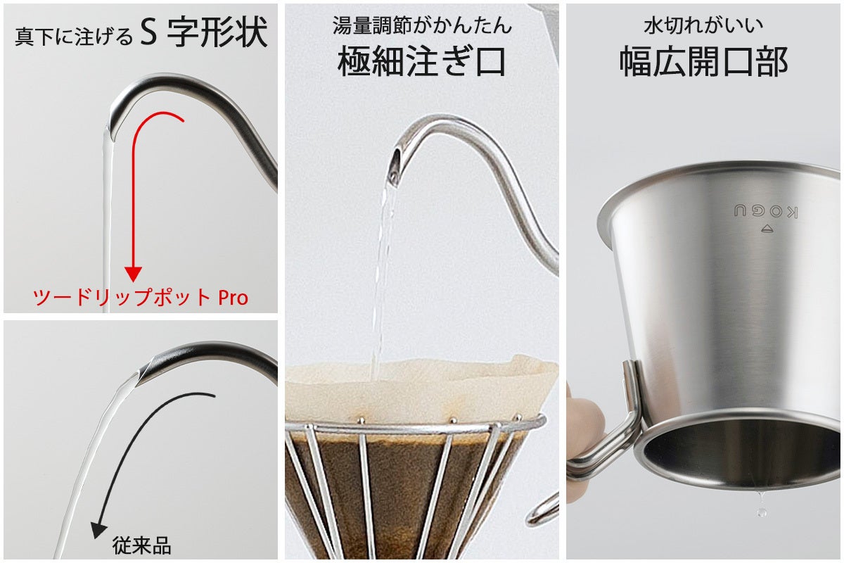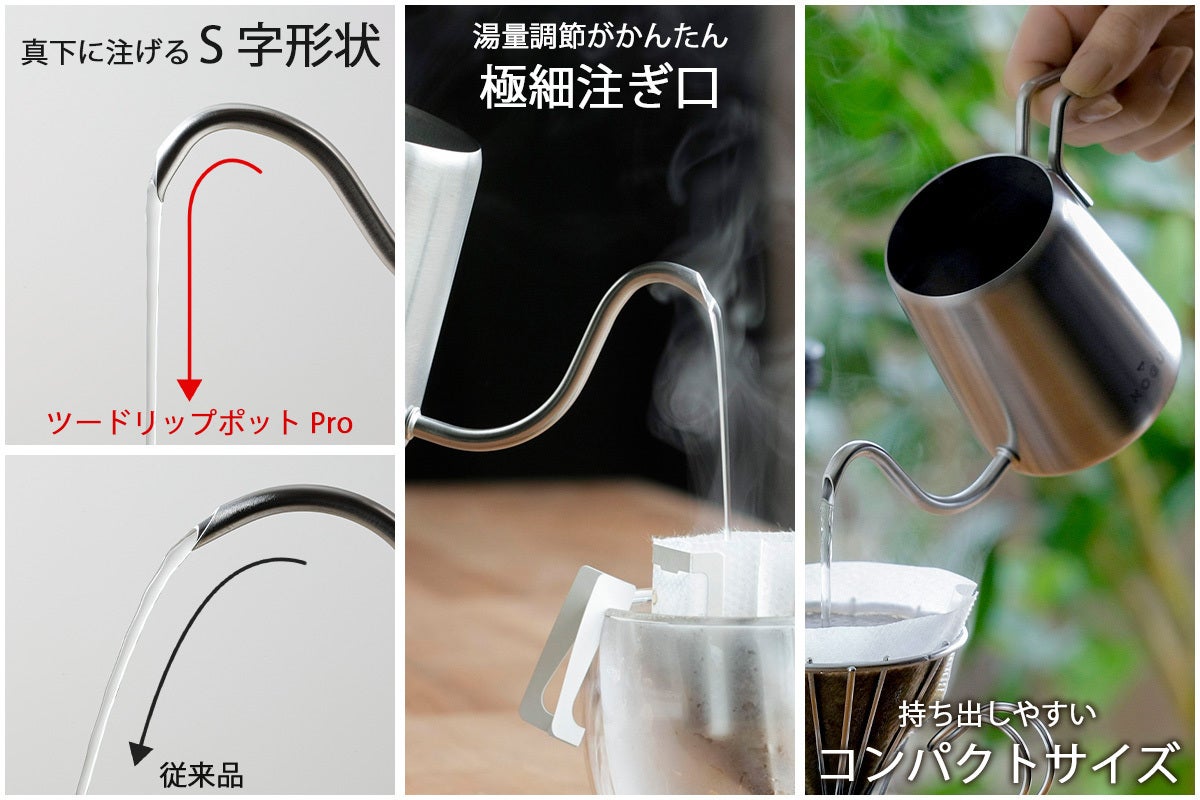 ●ツードリップポットPRO:サイズ/幅25.5×奥行13×高さ11cm、重量/325g、材質/本体・ハンドル:18-8ステンレス、底:21-0ステンレス、生産国/日本製
