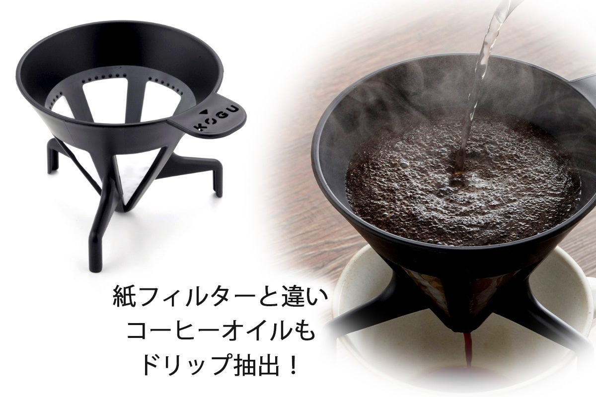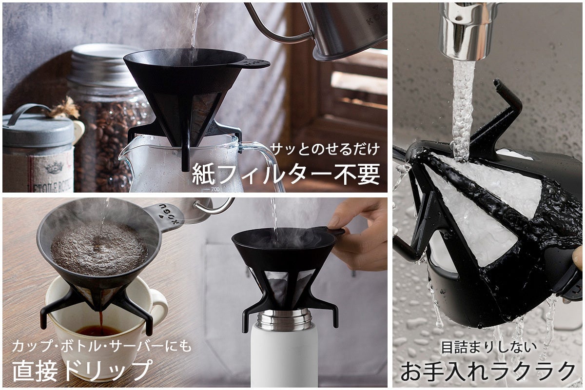 紙フィルター不要!お好みのカップの上に本体をのせて準備OK。紙フィルターがいらないので余分なゴミも出さずエコ。マグボトルに直接置いてドリップできる形状。もちろん、サーバーにも使用可能。約1~4人前のコーヒーが作れます。※コーヒー豆は中挽きをご使用ください。