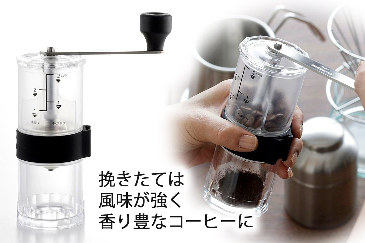 分量の目安となるコーヒー豆の目盛り付き。 お好みの豆を目盛りまで入れてクルクル回すだけ。①ミル部はセラミック製で、金属臭がなくコーヒー本来の風味を損なわない。②摩耗しにくい為、使い始めの挽き具合が持続。③粗さ調節ネジでドリップ方式に合わせた粗さを選べます。④セラミックミル部は取り外し、水洗いができます。⑤目盛りは浅煎り・中深煎りと分かれています。※目盛は目安です、お好みのコーヒー濃さは豆の分量等で調節してください。