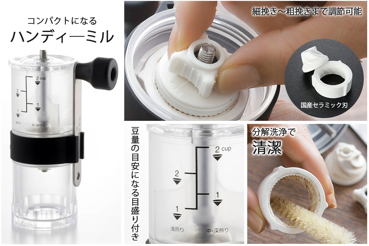 ●コーヒーミル:サイズ/幅13.5×奥行6×高さ17.5cm、重量/260g、材質/本体:ポリエチレン、フタ・容器:メタクリルスチレン、ハンドル:ステンレス・ポリプロピレン、刃部:セラミック磁器、滑り止めグリップ:シリコーンゴム、生産国/日本製