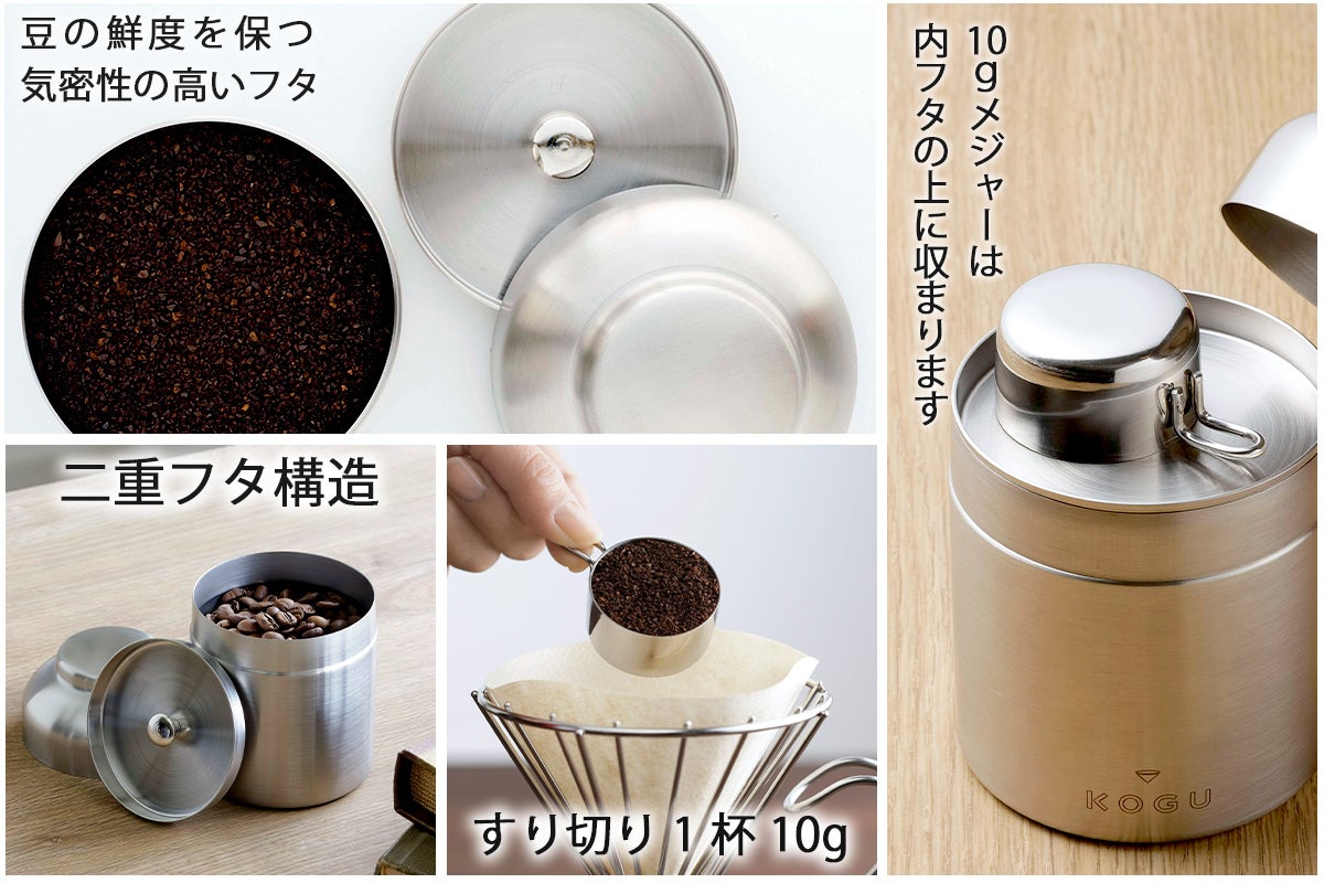 ●キャニスター:サイズ/外径7.9×高さ11.4cm、重量/165g、容量/400ml(コーヒー豆・粉の適正容量、約100g)、材質/18-8ステンレス、生産国/日本製