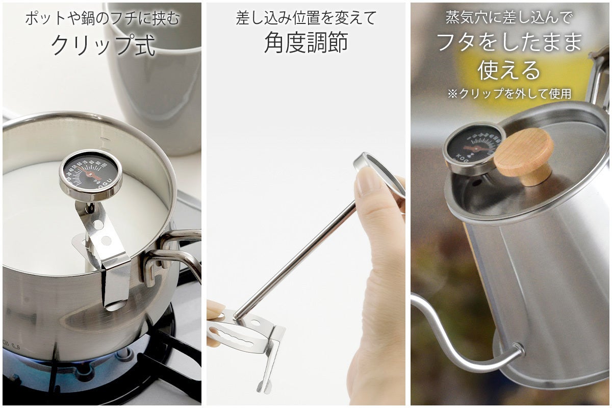 ・鍋フチに掛けられるクリップ付き。