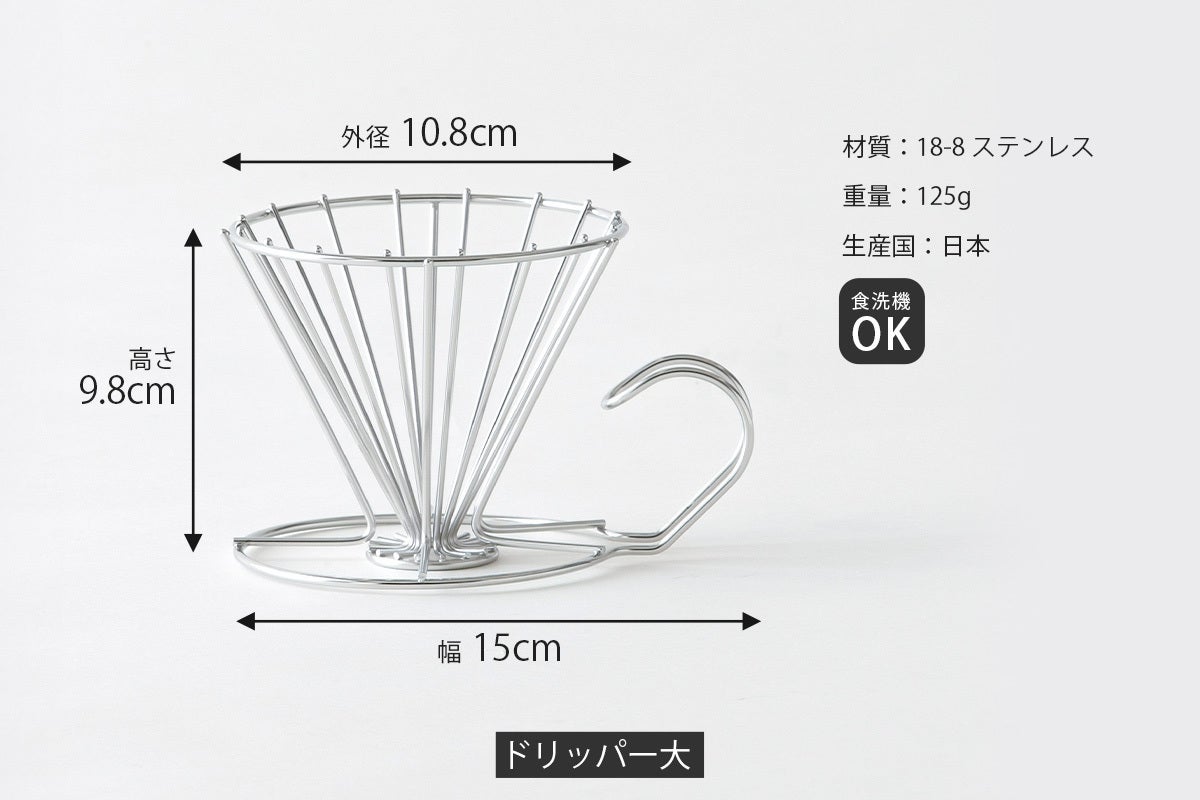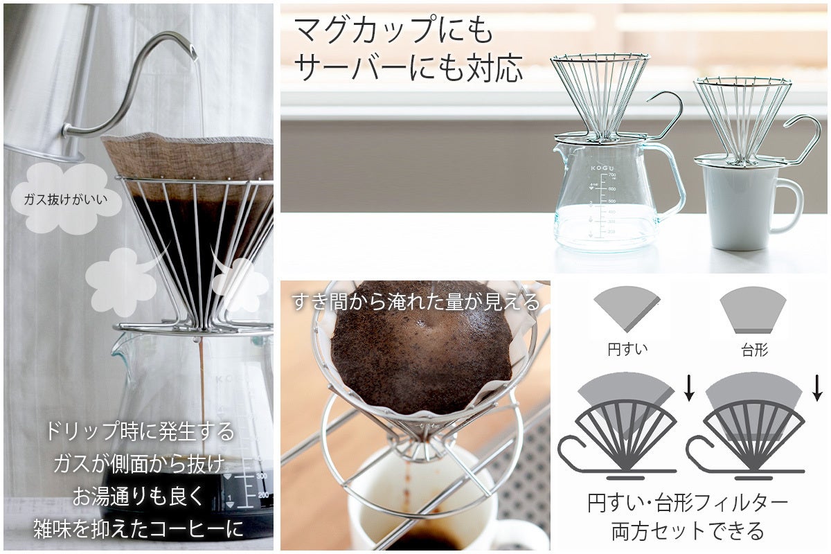・ステンレス線材のフレームは、ドリップ時に発生するガスが側面からも抜けるので、下に落ちるお湯の通りも良くなります。雑味の抑えた、香り立つ美味しいコーヒーが抽出できます。