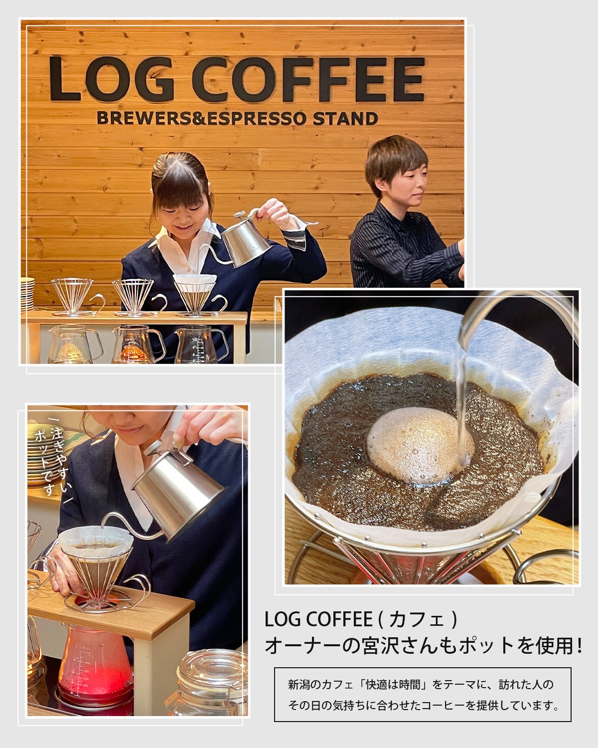 「このポットはズルい!」とLOGCOFFEEの宮沢バリスタは言った。 なぜなら初めてハンドドリップをする人でも、ねらったところに注ぐことができるから。ドリッパーのフチにお湯を当てずに、中心に注ぐことで美味しいコーヒーを淹れられます。