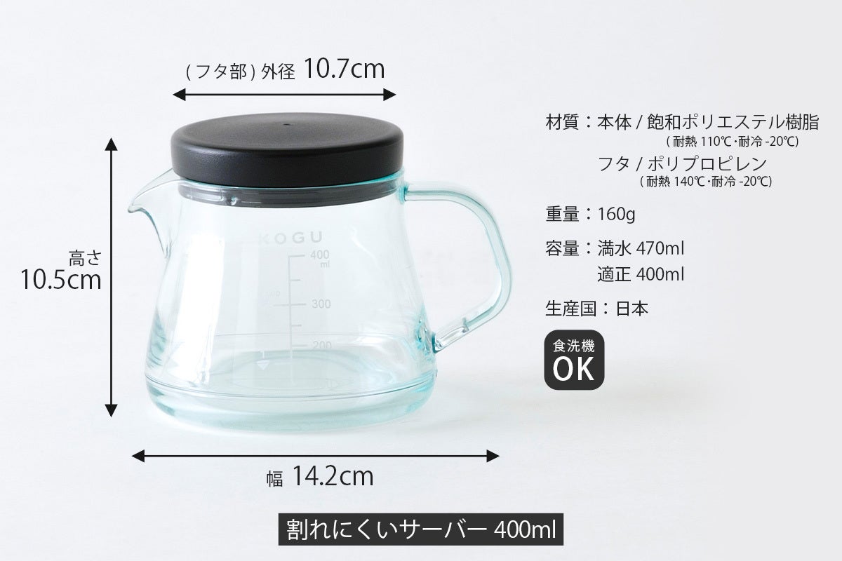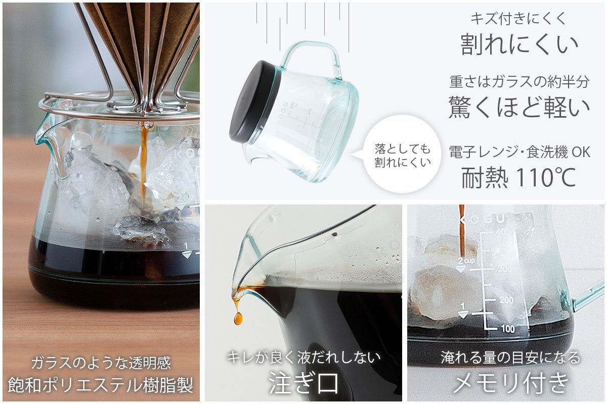 ・サーバーは丈夫で耐久性に優れる飽和ポリエステル樹脂を使用。軽量で落としても割れにくい。