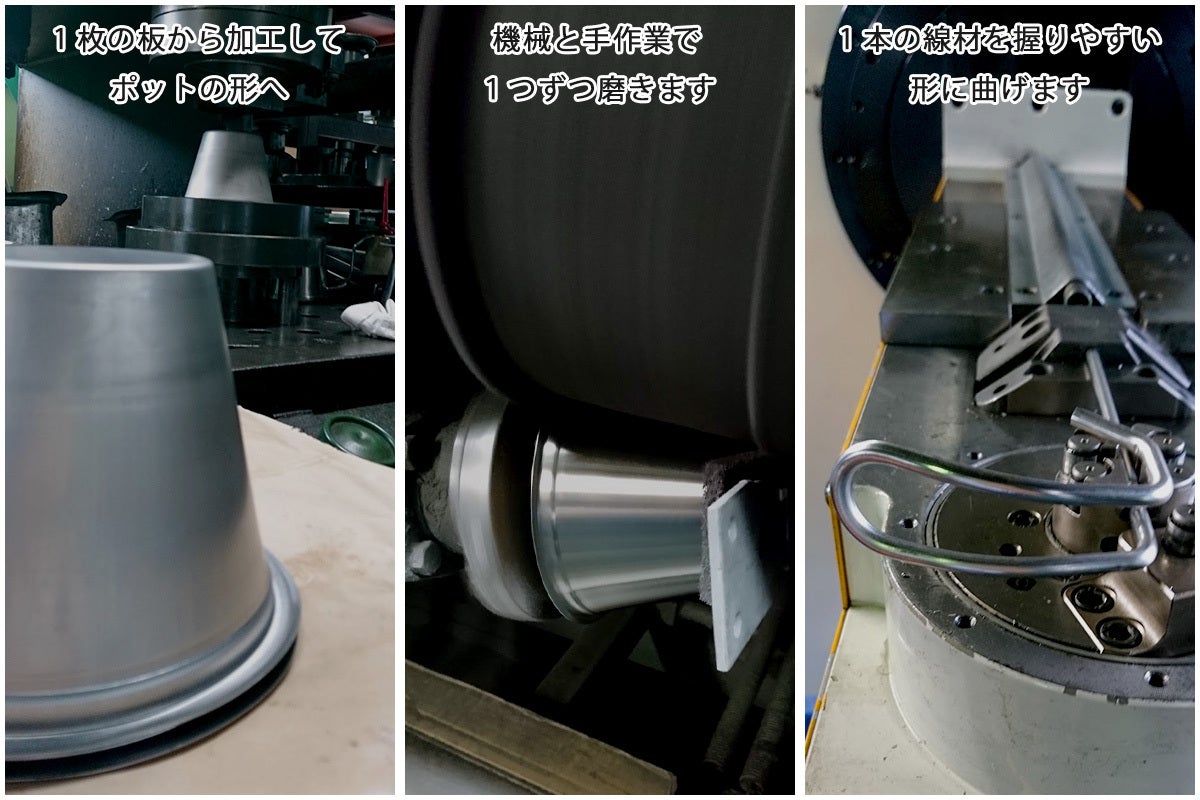 生産は歴史ある金属加工のまち新潟県・燕三条。400年引き継がれてきた技術で永く使える製品を作っています。素材を見極め、切断、成形、溶接、磨きなど職人が細部まで丁寧に仕上げています。