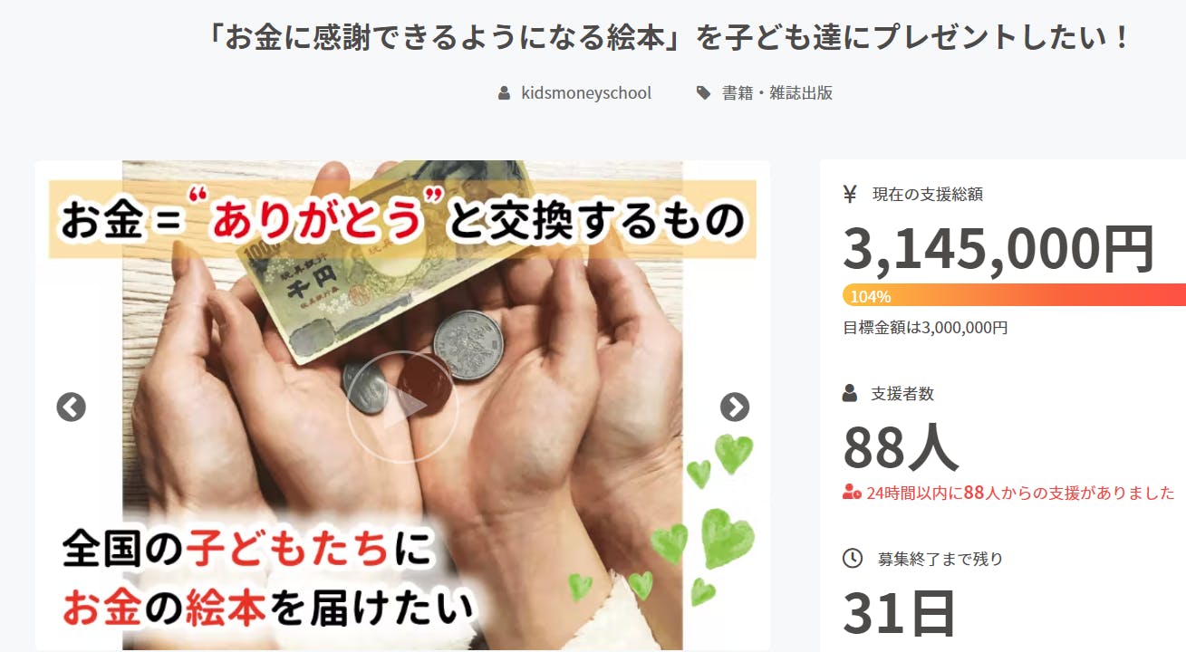 2022/03/03 19:44今日、事務局にこんな電話がありました。保護者「子どもと一緒に支援したいのですが コンビニ支払いでもできますか?」コンビニでも支援できることをお伝えしました。そのときに、お電話で、経緯をお聞きしました。保護者「まだ小学生の息子ですが、 クラウドファンディングで、 支援することを親子で一緒に学ぼうと思って。 『おかねの絵本』もステキで、 活動を応援したいと思ってたんです。 それを親の私だけではなくて、 子どもと一緒に応援することをしたくて。 少しでもわかってくれるといいな、 って思って支援しようと思いました」・事務局のスタッフたちね、感動で嬉し泣きしました。。。・「全国の幼稚園・小学校に絵本を寄贈する」クラファンがスタートして、3日が経ちました。本当にたくさんの皆さんが、この企画に賛同、そして支援をいただいています。本当にありがとうございます!・私たちの目的は、目標金額を達成することではなく、一冊でも多くの絵本を子どもたちに届けること。・まだまだ頑張りますので、ご支援よろしくお願いします!この本を読んだ多くの親子が、「お金ってありがとうと交換するものなんだね!」って親子でハナシができる。それが私たち大人が、これからの日本を背負っていく、子どもたちへの貢献だと思っています。 もっと見る