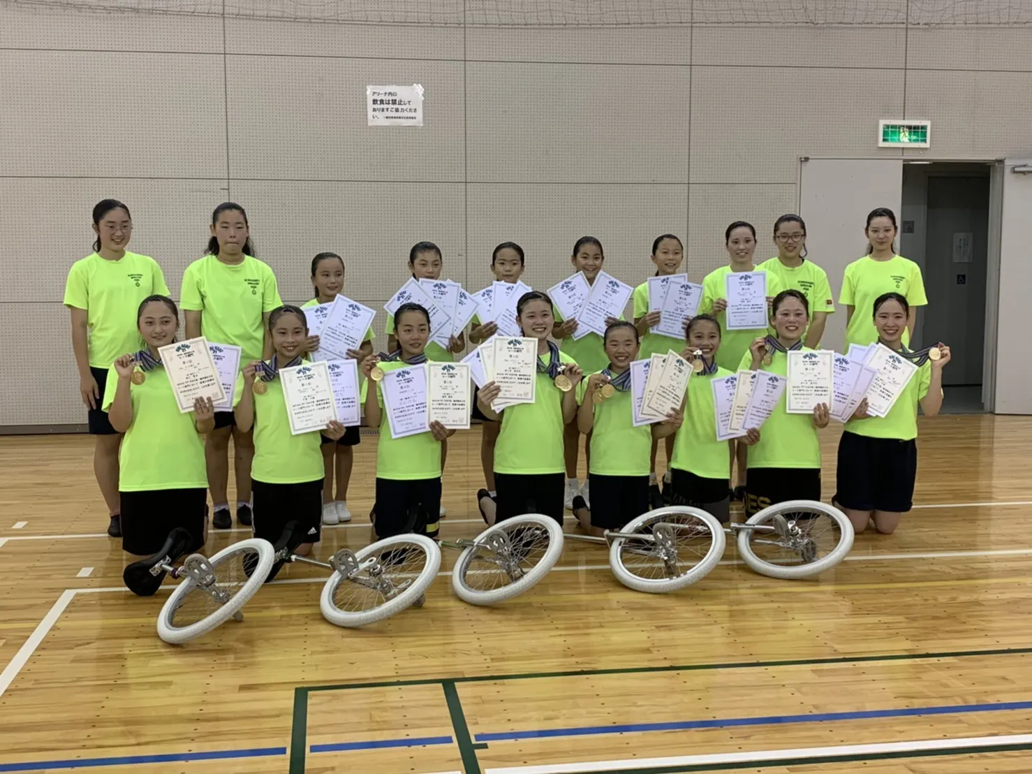 毎週火、木、土曜日に練習に励み、これまで全日本一輪車競技大会など多くの大会に出場し、好成績を残しています。また、クラブでは技術面の向上はもちろん、誰にでも『挨拶』『感謝』をモットーに励んでいます。
