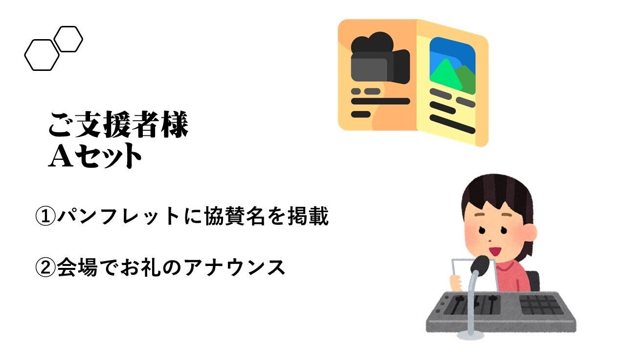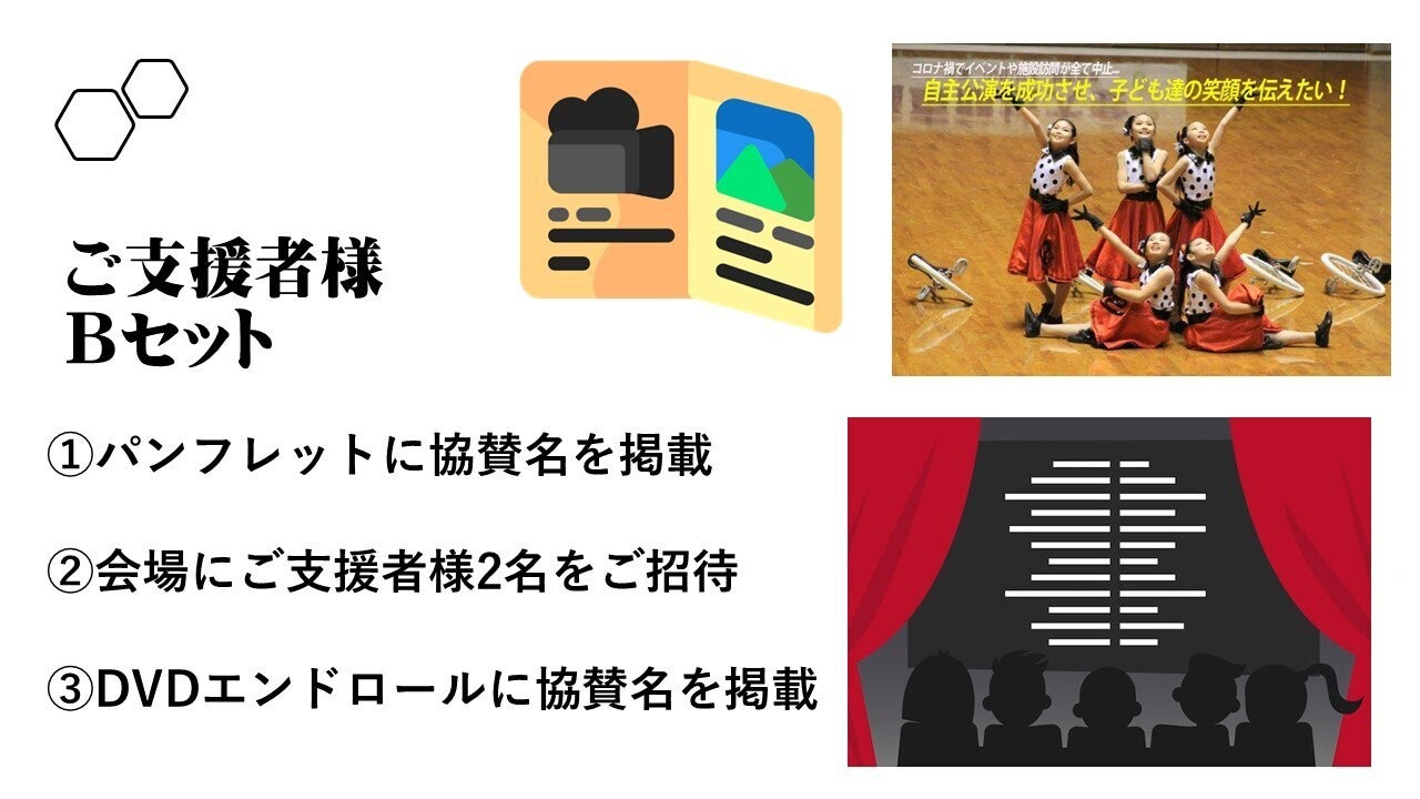 パンフレットに協賛名を掲載 + 会場にご支援者を招待 + DVDエンドロールに協賛名を掲載