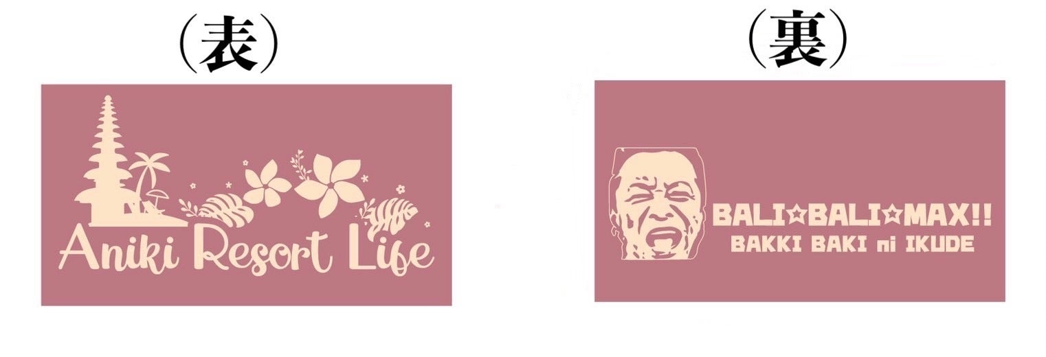南国バリ島、神々の島と呼ばれるにふさわしいイメージを元に、バリ島を代表するお花プルメリアと寺院をあしらったタグをデザインしました。タグの裏側にはアニキの顔をあしらい、アニキが応援する時に使う言葉「バッキバキに行くで」をローマ字「BAKKI BAKKI ni IKUDE」にしました。
