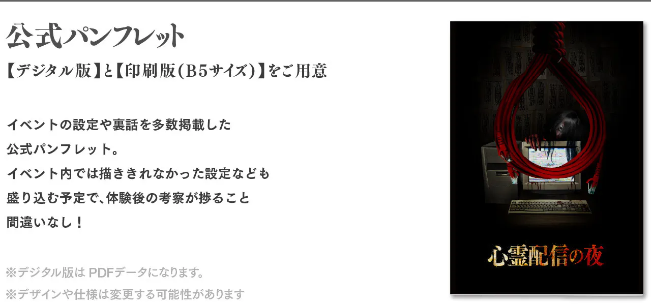 ・ホラー要素を取り入れた演出があり、映像は暗く一部ショッキングな音声が流れます。心臓の弱い方はご参加をお控えください