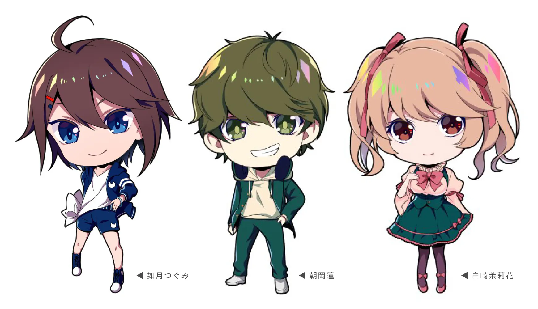 如月つぐみ/朝岡蓮/白崎茉莉花 の書き下ろしちびキャライラストで作成しました、アクリルスタンドです。手のひらサイズのとっても可愛い3人組になります。