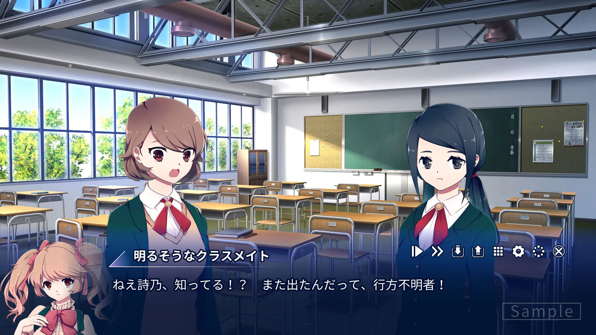 フリー版の画面は、昨今のノベルゲーム界隈の中ではかなり小さめで、テキストもMAX3行の構成となっており、文字送りなどもありません。
