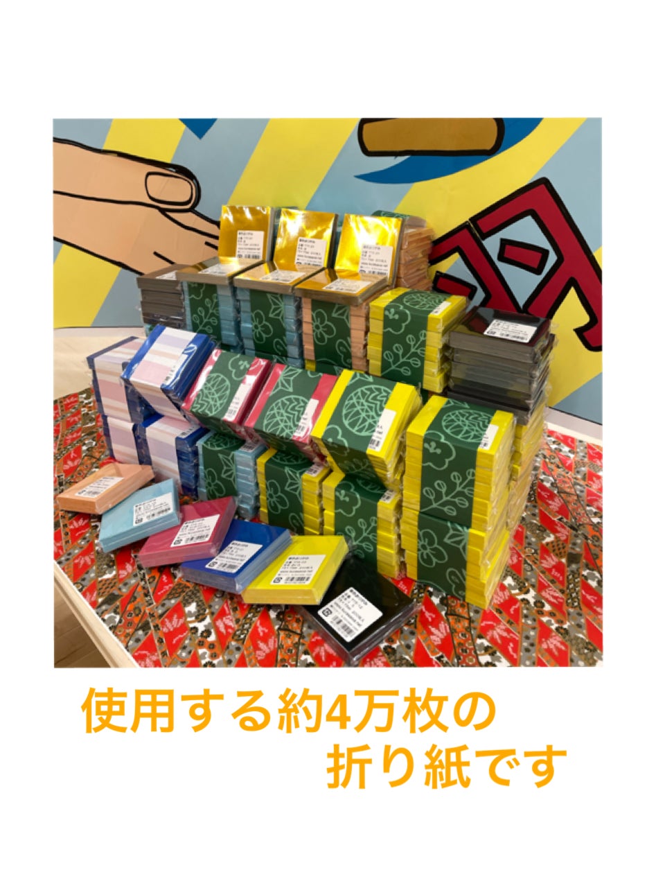 全校児童・保護者・先生・職員のみんなで、各自が担当する折り紙の鳩を70羽折ります。その後、台紙に鳩をのりで貼り付けて完成させます。回収した504枚の台紙を、縦5.7m×横13mのテント生地に全て貼り合わせて、体育館に吊るし巨大壁画を完成させます。折り紙で折った鳩の展示数で『世界記録達成』を実現したいと思っております。