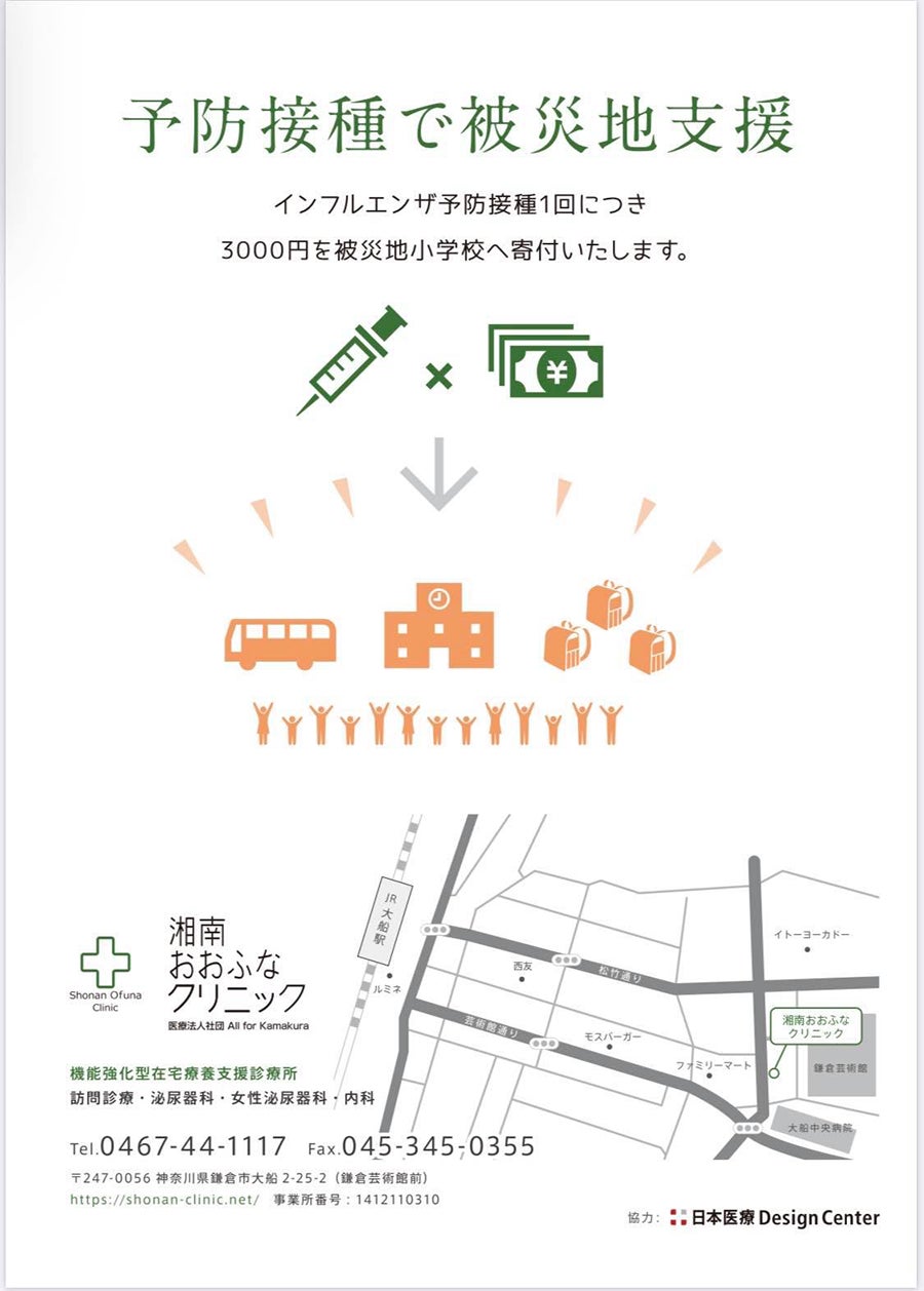 当クリニックでは3年前より『予防接種で被災地支援』として、インフルエンザ予防接種1回につき3,000円を被災地小学校へ寄付してきました。