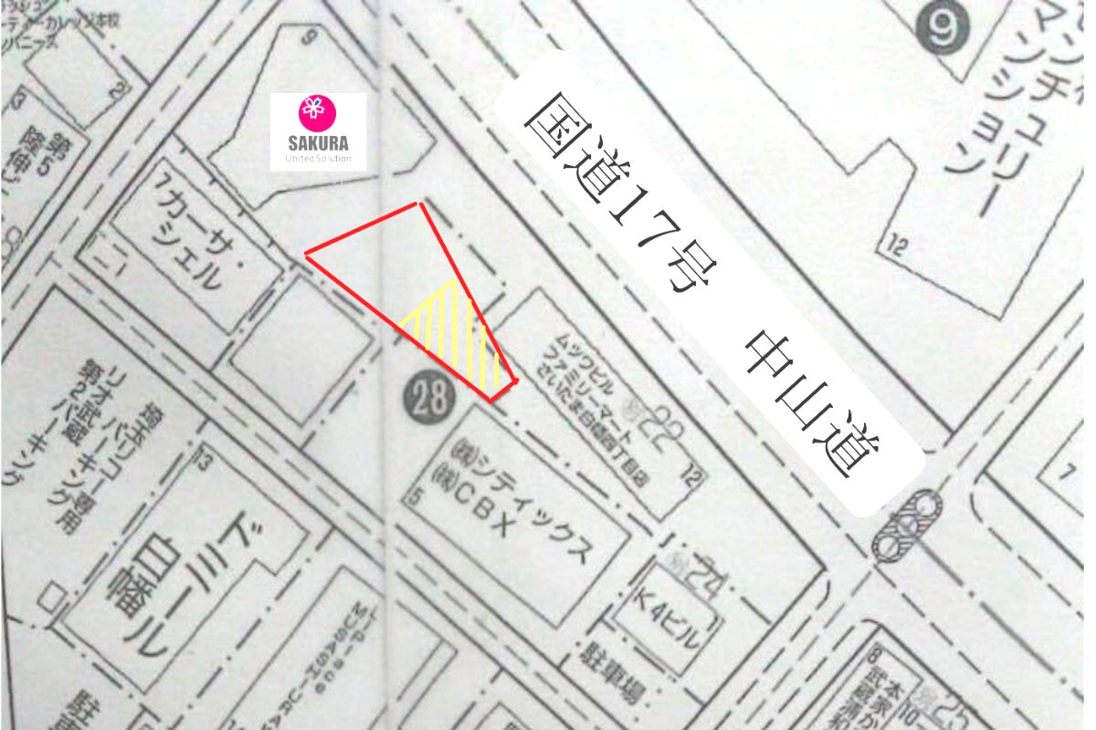 建物の脇には、無道路地の駐車場にも使えない草ボウボウの空き地があります。下の地図の赤色の台形部分です。
