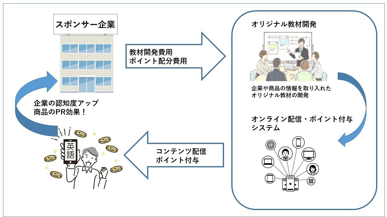 ビジネスモデルは次の通りです。まず、商品やサービスの宣伝をしたいスポンサー企業が、教材開発費や配分するポイントの費用を提供します。スポンサー企業から依頼を受けると、私たちはその会社の商品やサービス内容を研究し、その内容を盛り込んだオリジナル教材を開発します。教材には、その会社名、商品、サービスの内容を、その例文などに盛り込みます。できあがった教材は、Webサーバーから配信します。