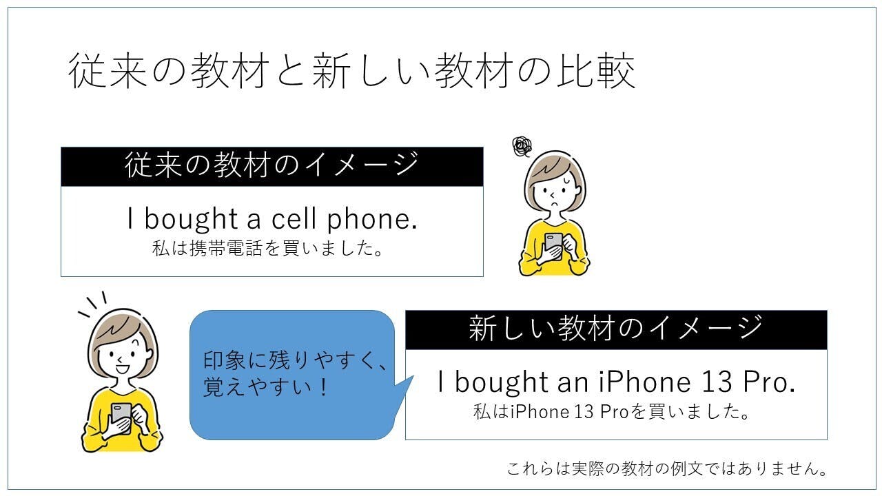 ポイント付与付きWeb学習の秘密は、教材に使われている英文にあります。今までの教材に出てくる英文の多くは無味乾燥で、実生活と切り離されたものが多く使われていました。たとえば、"I bought a cell phone. "(私は携帯電話を買いました)というよりも、"I bought an iPhone 13 Pro."(私はiPhone 13 Proを買いました)の方が実生活に合っていて、記憶にも残りやすく、また楽しいですよね。でも「教材」に特定の商品名やサービス名を入れることは好ましいことではないという風潮があり、架空の商品名や当たり障りのない普通名詞を使わざるを得なかったのです。