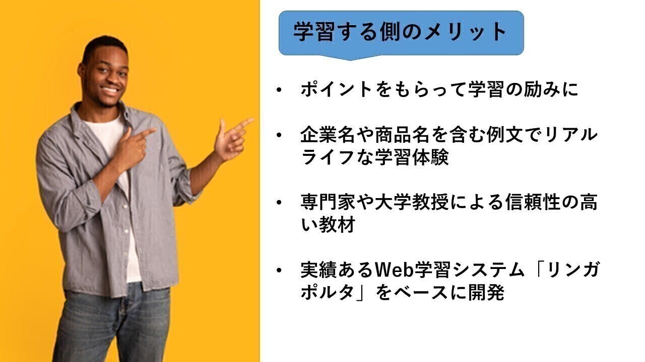 クラウドファンディングでの皆様のご支援により、新たにポイント付与機能を付けた「新リンガポルタ」を立ち上げることができます。そして、そのコンテンツは、信頼性の高いものにしなければ意味がありません。そこで、スポンサー企業と連携して、しっかりとした教材を作り、広く社会に貢献できる仕組みを構築したいと考えています。