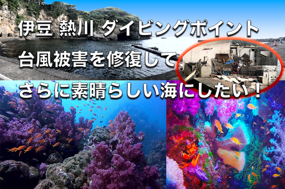 伊豆熱川の台風被害を修復してさらに素晴らしい海(ダイビングポイント)として安全に安心してダイビングをお楽しみいただけるように修復及び施設拡張を目指しております。