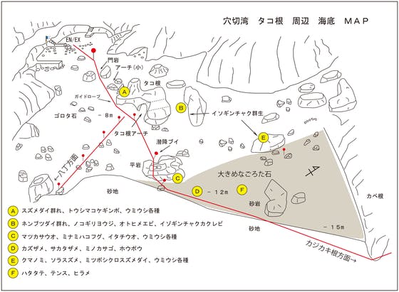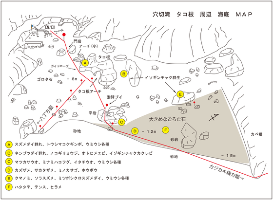 赤いラインは水中ガイドロープが現在設置(仮止め)してある場所となります。