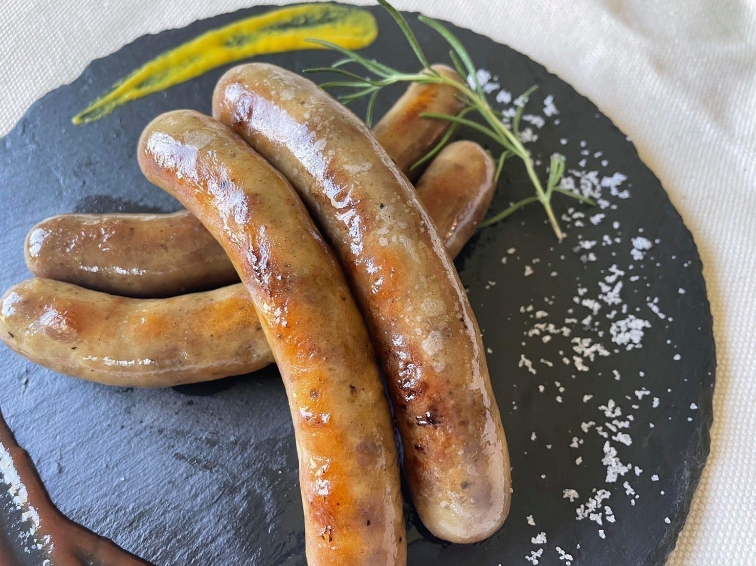 『鹿と豚のマーブル』 という名前をつけました。 通常、他の肉同士は混ぜないのがソーセージのセオリーですが、鹿肉100%を原材料とせず、あえて豚肉も使い、食べ慣れた物と一緒に少しづつ試して欲しい。 今回のプロジェクトで田舎の猟師と都市部の料理人とが、一つの料理で繋がってできたソーセージ。