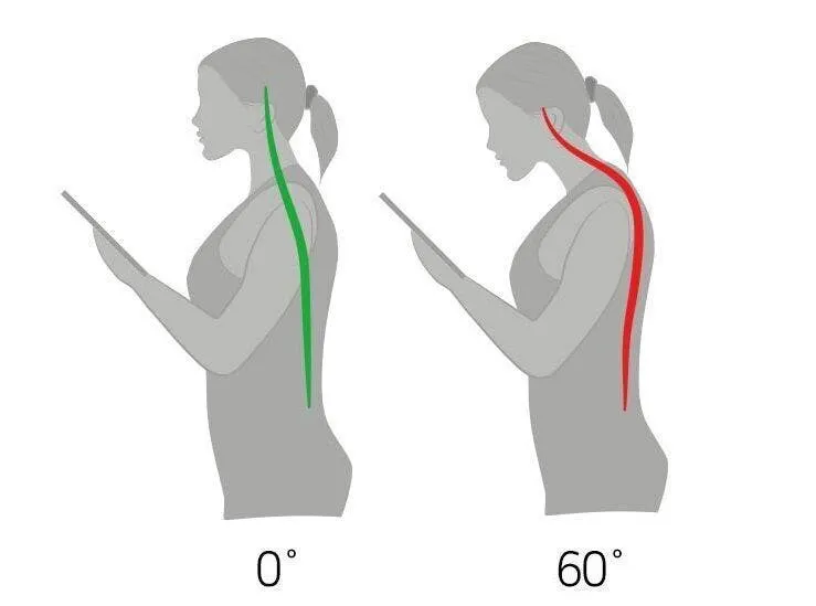 PCやスマホ、タブレットを見る時の平均角度が60度と言われています。加わる圧力は27㎏に達し、これは7歳の子供の平均体重と同様の圧力と言われています!