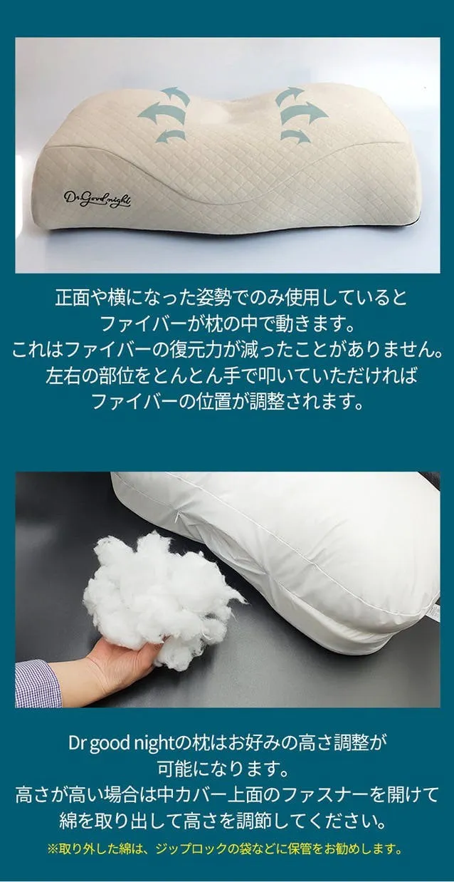 Dr. good night 枕で使用されるエアシンクファイバーは弾力性と柔らかさがあり圧力がかかると一定期間沈み込み頭をしっかりと支える事が出来ます。そして圧力が軽くなるとすぐに戻の状態へ戻ります。あなたの頭の重さに合せて枕の最適な高さをキープします。