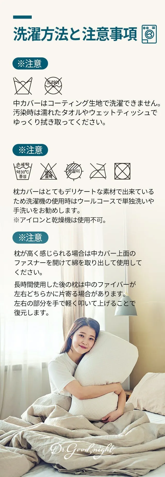 付属の枕カバーはとてもデリケートな素材で出来ているため洗濯機の使用時はウールコースで単独洗いや手洗いをお勧めします。アイロンと乾燥機の使用はお控え下さい。
